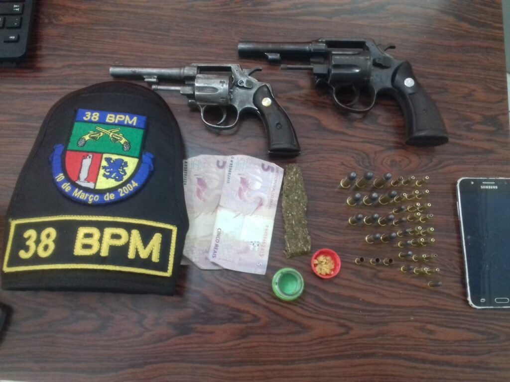 Com eles os brigadiano apreenderam 0,75 g de crack, 8,6 g de maconha, 10 reais em moeda corrente, 1 aparelho celular, 1 revólver cal.38 com numeração suprimida, 1 revólver cal.22, 6 munições cal .38 intactas, 6 munições cal.32 intactas, 25 munições cal.22 intactas e 3 cápsulas de cal .22 deflagradas.