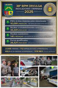 O 38º Batalhão de Polícia Militar apresenta os principais indicadores criminais e operacionais referentes ao ano de 2025, em comparação com 2024, evidenciando resultados expressivos tanto na redução dos índices criminais quanto no aumento da produtividade operacional.