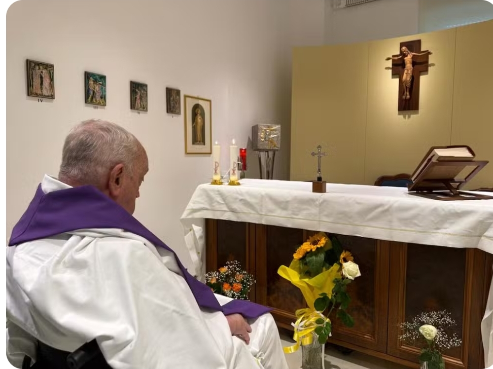 Na imagem, o Pontífice aparece de costas celebrando a Santa Missa na capela do apartamento localizado no décimo andar do hospital Policlínico Gemelli, em Roma, na Itália.