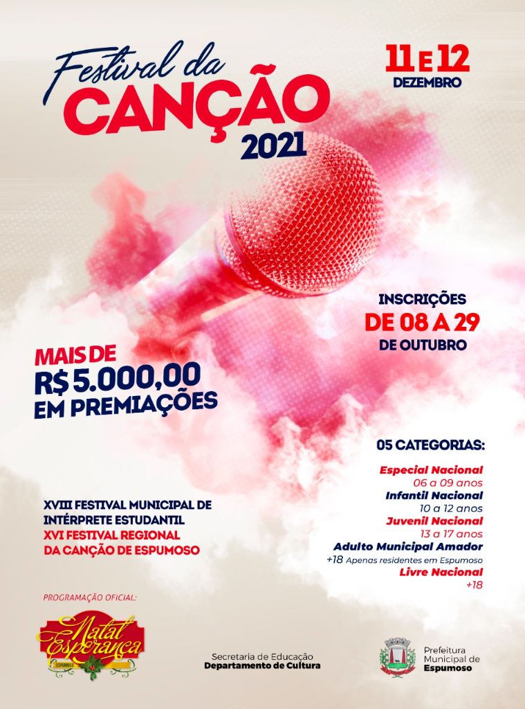 Marcado para acontecer nos dias 11 e 12 de dezembro de 2021, no Auditório Veranice Guerreiro Pimel, junto ao Centro Cultural Dr. Getúlio Soares de Chaves de Espumoso, estão abertas as inscrições para o XVIII Festival de Intérprete Estudantil e o XVI Festival Regional da Canção de Espumoso.