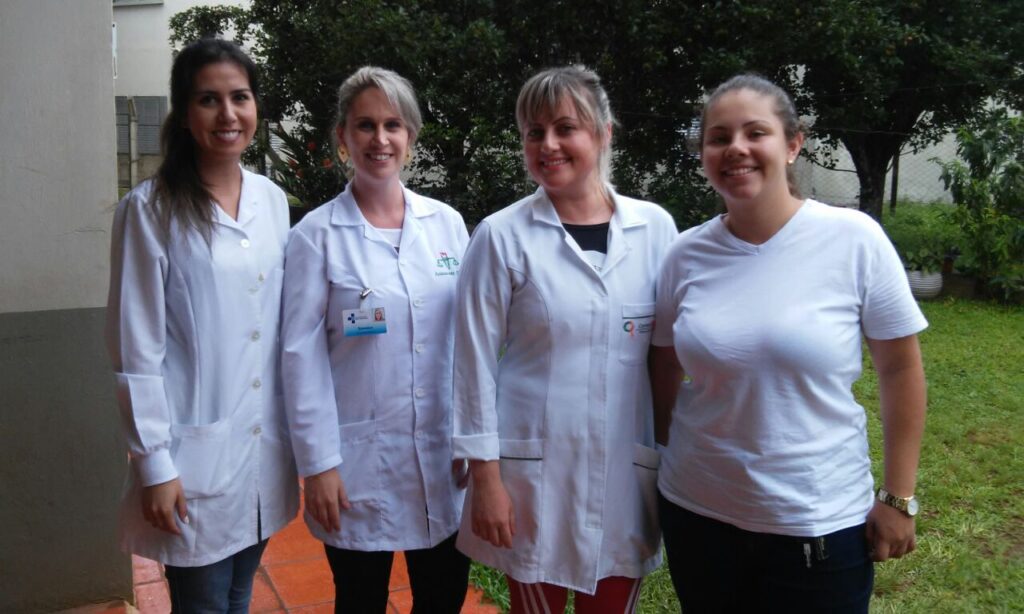 Em foto a acadêmica de educação física Amanda Demétrio dos Santos (última da direita na foto), a técnica de enfermagem Aline Maria Hansen, assistente social e coordenadora do setor Vanessa Spezia Gheller e a psicóloga clínica Lucimara Falcão.