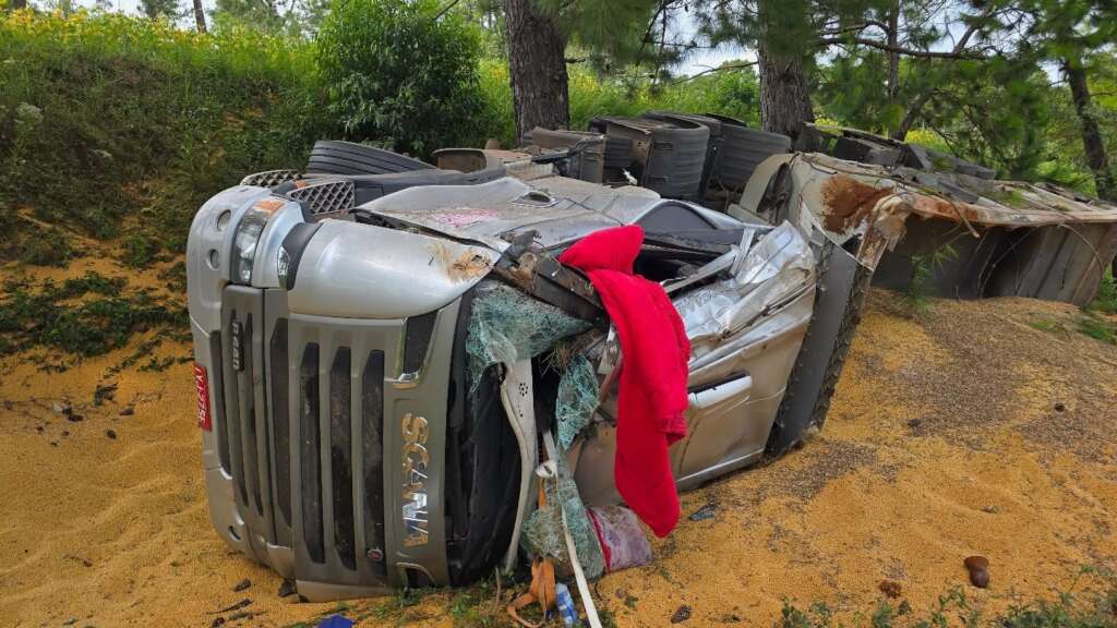 De acordo com informações apuradas no local, o condutor de um caminhão Scania R440, com placas de Cruzaltense, que transportava uma carga de soja, perdeu o controle da direção do veículo em uma curva. O veículo saiu da pista e capotou às margens da rodovia. Com o impacto, a cabine ficou completamente destruída.