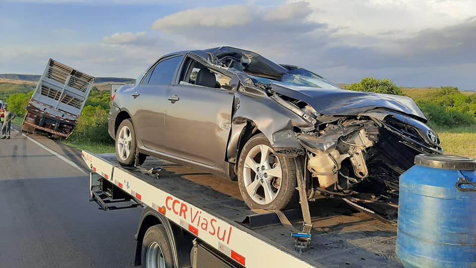 Com o impacto, o Corolla invadiu a faixa contrária e colidiu na frente de um outro caminhão, este de Erechim.