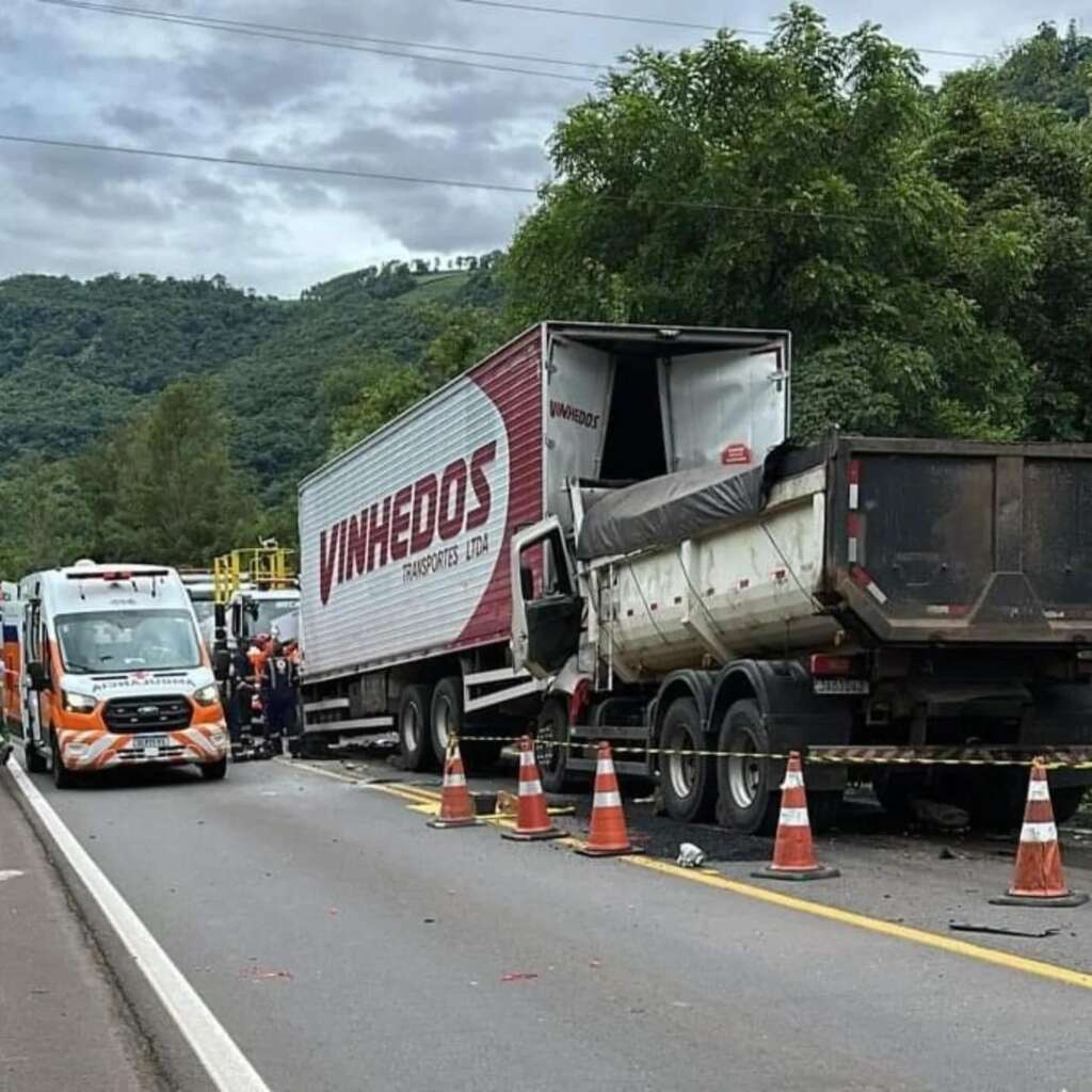 Uma colisão envolvendo um caminhão caçamba e um caminhão-baú resultou em outro impacto com uma carreta contêiner que estava à frente.