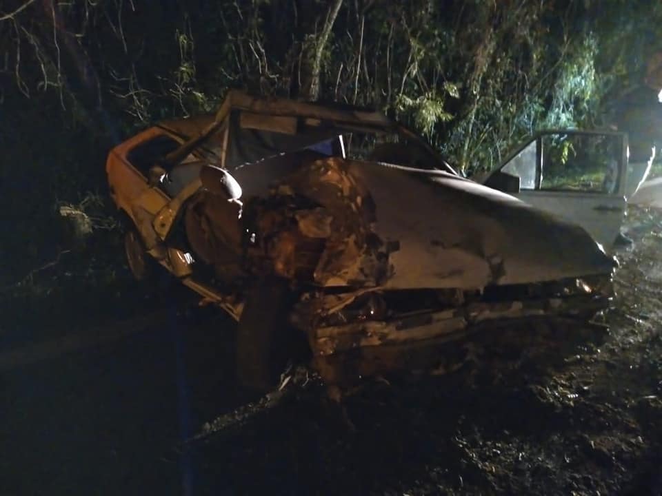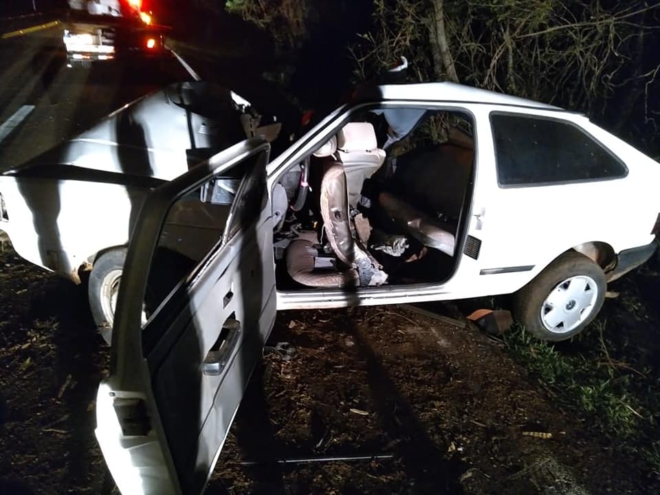 Um veículo gol trafegava na rodovia quando por motivos ainda desconhecidos saiu da pista e colidiu em uma árvore as margens.