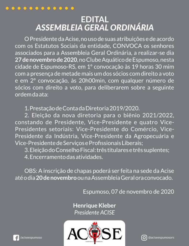 Confira abaixo, o edital de convocação, lançado pela ACISE, para a Assembleia Geral Ordinária, que será realizada no dia 27 de novembro de 2020, no Clube Aquático de Espumoso.
