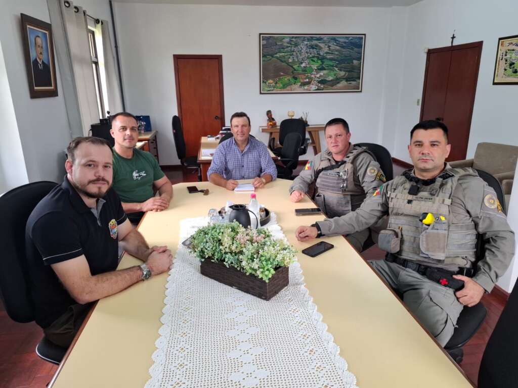 Na manhã desta segunda-feira, 12, estiveram reunidos no gabinete do prefeito em exercício Marcos André Soares, o Secretário da Administração e Desenvolvimento Dioni Junior Ribeiro, o Assessor Jurídico Andrei Scherer Pereira, e os integrantes do efetivo da Brigada Militar do município, SGT PM Ivair e SD PM Javier.