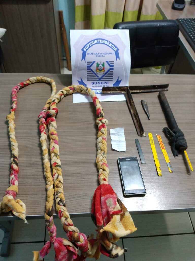 Constatada a ausência de algumas grades na janela, encontraram quatro serras, duas jiboias (cordas para fuga), um aparelho celular e pedaços da grade que foi serrada.