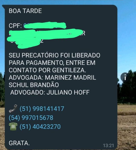 A OAB – Subseção Espumoso, vem por meio deste comunicado, alertar a população sobre uma tentativa de golpe que está ocorrendo por meio do aplicativo de mensagens WhatsApp. Golpistas estão utilizando indevidamente o nome, foto e dados do Escritório MB Advocacia, pertencente à Drª Marinez Madril Schul Brandão, inscrita na OAB/RS sob o número 104.135, para entrar em contato com clientes em potencial.