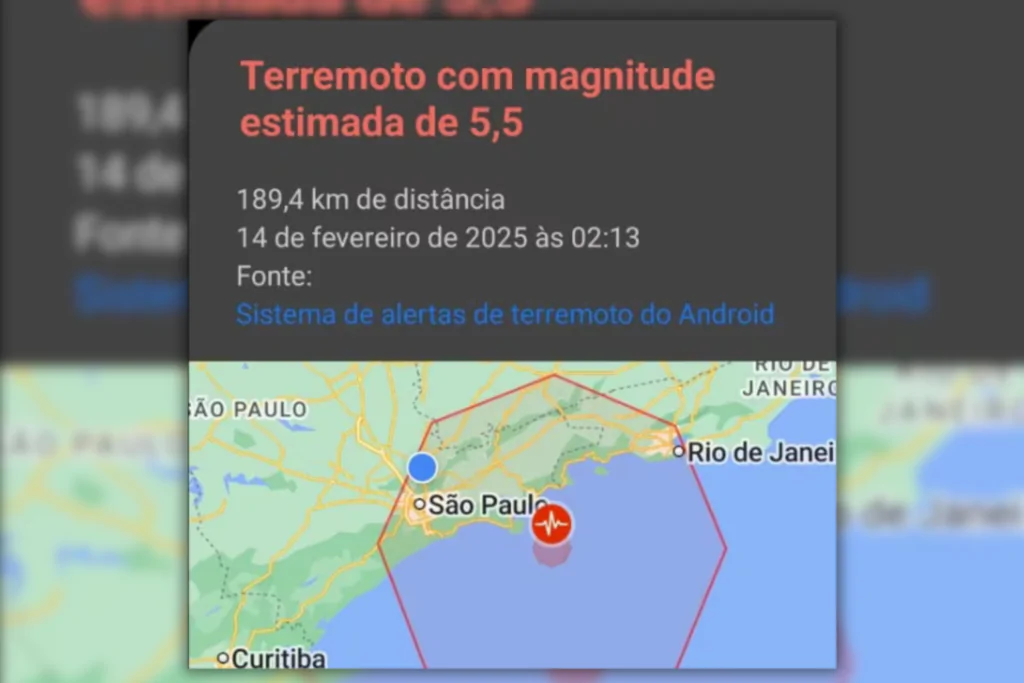 Um alerta do Google para um suposto terremoto no mar, a 55 km de Ubatuba, no litoral de São Paulo, foi enviado para celulares com sistema operacional Android na madrugada desta sexta-feira (14). Apesar do epicentro estar indicado no litoral, o aviso também chegou para moradores da capital paulista, do Rio de Janeiro e de Minas Gerais.