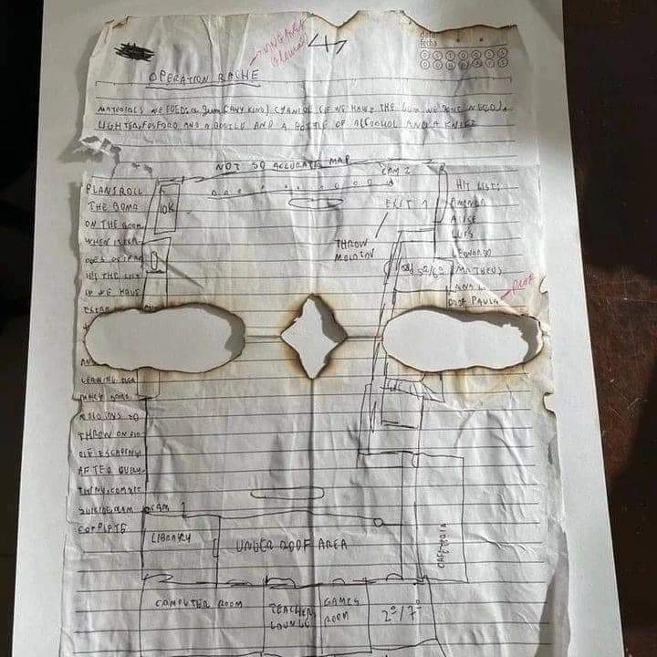 O plano era usar bombas, coquetel molotov e faca para promover um massacre na escola. Havia nomes dos alunos e do professor que seriam mortos.