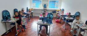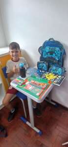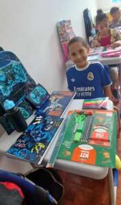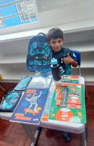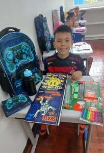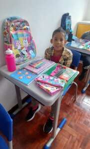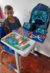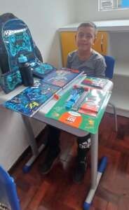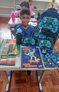 Mochilas, cadernos, estojos, garrafinhas de água, lápis de cor foram alguns itens distribuídos entre o alunos.