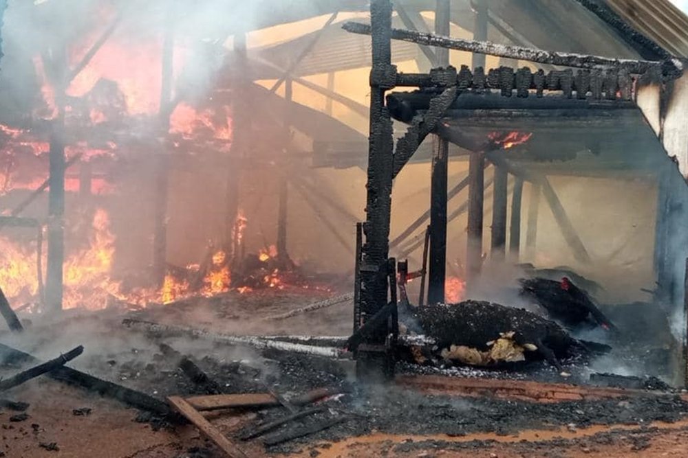 Fogo destruiu galpão e atingiu também um chiqueiro e estrebaria. (Foto: Rádio Sucesso FM)
