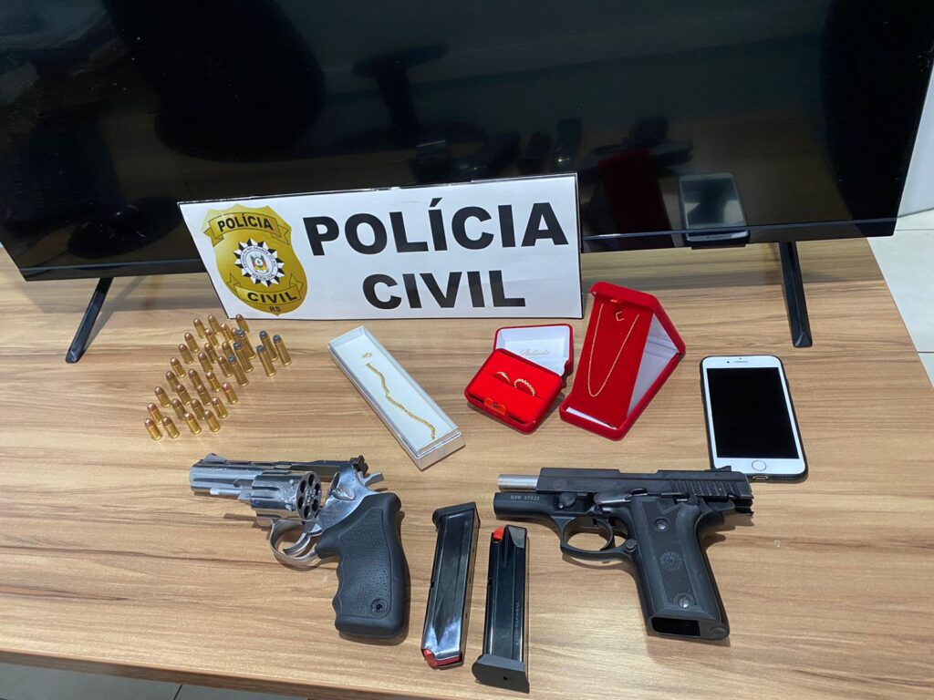 No local foram apreendidas duas armas de fogo, sendo um revólver calibre 38, com numeração raspada e uma pistola calibre 380 furtada, além de munições e outros objetos adquiridos com valores do tráfico, como jóias de ouro.