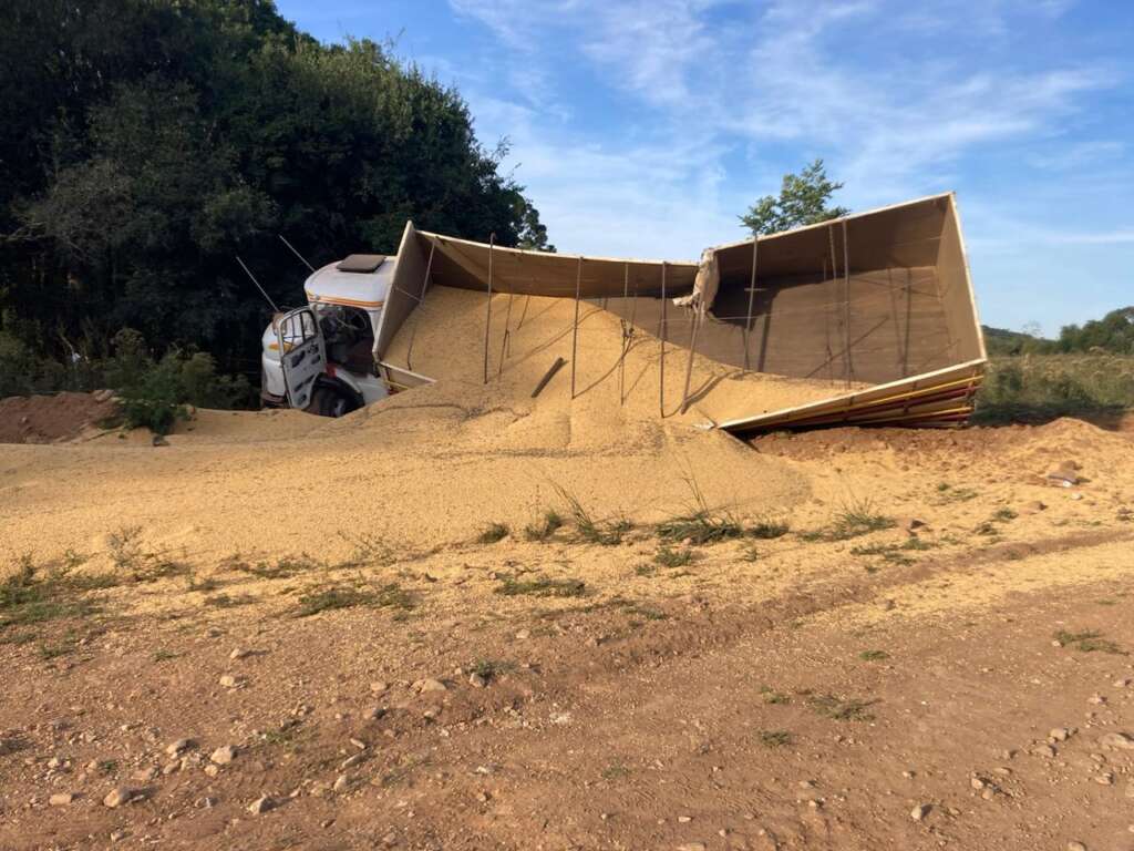 Um caminhão carregado com soja perdeu o freio, saiu da estrada e acabou tombando numa ribanceira. De acordo com testemunhas, o condutor foi projetado para fora do veículo e ficou soterrado sob a carga. Infelizmente, o homem não resistiu aos ferimentos e veio a falecer no local.