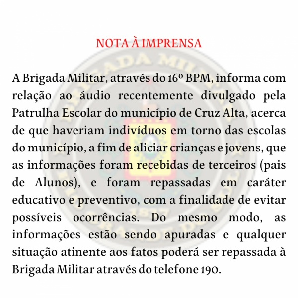 Na última quarta-feira (14), um suposto áudio gravado por um diretor de uma escola em Cruz Alta causou preocupação entre pais e alunos na região. No áudio, um homem se identificando como diretor de uma escola no município alertava sobre supostos aliciadores de menores que estariam em frente a escolas do município, tentando aliciar crianças para a prostituição. Não demorou muito para que o áudio ganhasse ampla repercussão entre os grupos de WhatsApp de toda região, fazendo com que a Brigada Militar do 16° BPM emitisse uma Nota de Imprensa a toda comunidade: