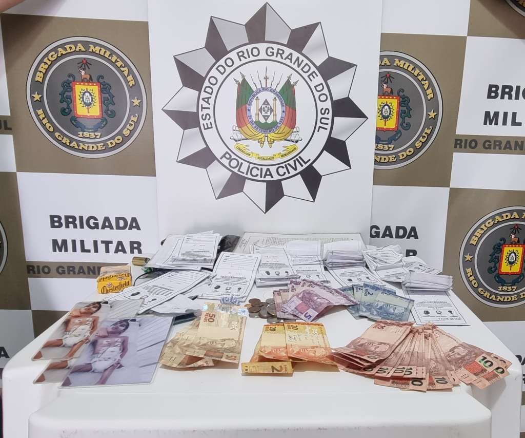Com eles os policiais encontraram vários blocos de rifa, R$ 462,25, veículo Fiat Pálio e comprovantes de contratos.