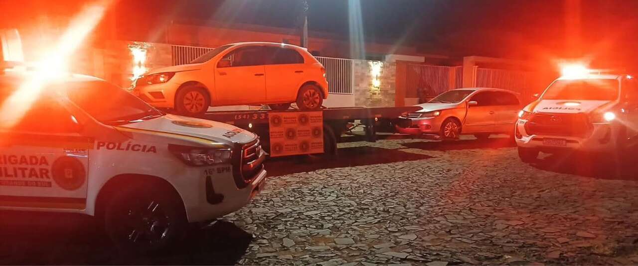 As guarnições de Ibirubá, em constante estado de alerta e patrulhamento, localizaram em um endereço conhecido pela traficância um VW/Gol pertencente a uma empresa de transporte de malotes. No local, dois homens foram detidos — um deles foragido da justiça que tentou usar nome falso — e duas mulheres foram presas por posse irregular de arma de fogo. Com o grupo, foi encontrado um arsenal que incluía espingarda, munições de diversos calibres e até uma motocicleta com placa adulterada.