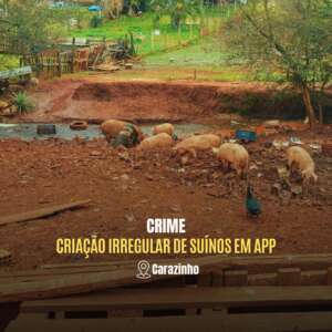 A vistoria foi realizada em conjunto com equipes do Bem-Estar Animal, Secretaria Municipal da Agricultura e Inspetoria Veterinária Estadual, em área localizada no perímetro urbano. No local, foi constatada a criação de 41 suínos em Área de Preservação Permanente (APP), além da construção de uma pocilga. Os dejetos da criação escoavam diretamente para o solo, com destino a um curso d’água, sem estrutura de contenção adequada. Também foi constatada, em outro ponto, a criação de equinos e bovinos.