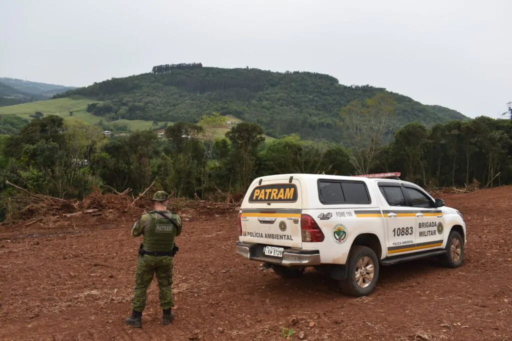 Para avaliar e mensurar o dano ambiental, os policiais militares utilizaram uma aeronave remotamente pilotada (drone). Conforme análise da mata remanescente, foi possível identificar a destruição de árvores popularmente conhecidas como Angico, Canela, Timbó, Açoita-cavalo, Sete-capotes e Pinus elliotti (exótica).