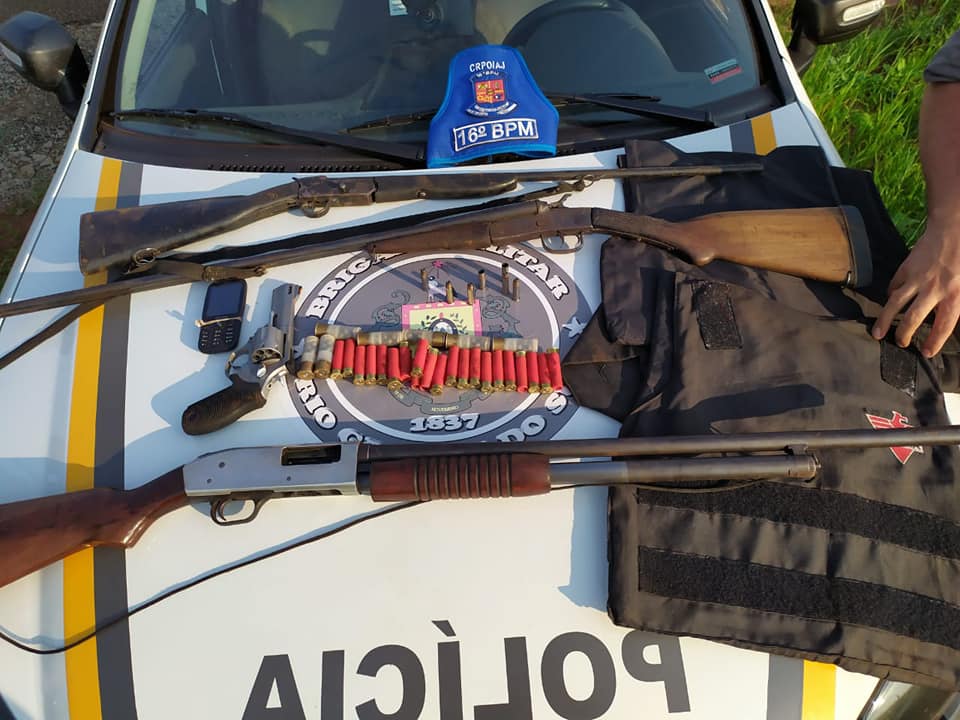 Com os quatro foram apreendidos um (01) revólver cal .357 , uma (01) espingarda cal .12, uma (1) espingarda cal. 28, uma (01) espingarda cal .36, um (01) colete balístico, uma (01) porção de maconha, dois (02) celulares e diversas munições. Os criminosos que também são suspeitos de roubos ocorridos pelo interior da região, sempre com emprego de violência e grave ameaça, foram apresentados na Delegacia de Polícia de Carazinho e posteriormente encaminhados ao presídio daquela cidade.