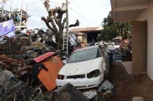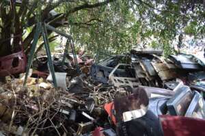 A força-tarefa localizou um depósito com diversas peças automotivas sem identificação e sem comprovação de origem. O local funcionava como desmanche e comércio irregular de veículos, sem qualquer licença ambiental.