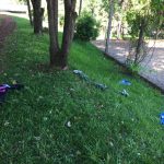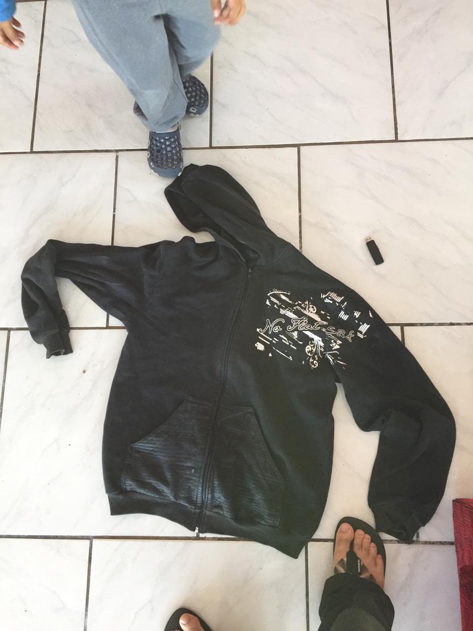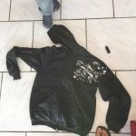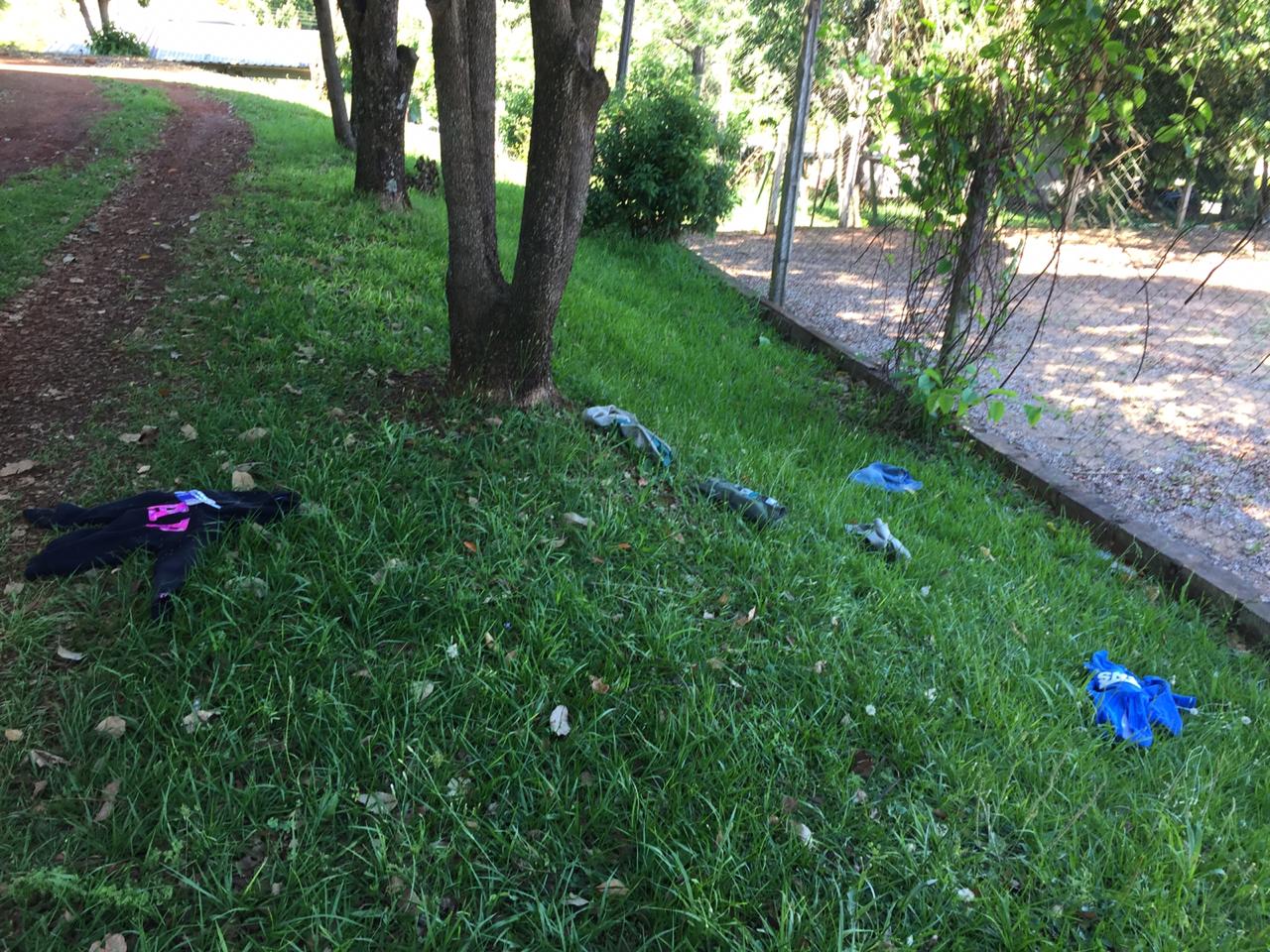 No local, foram localizadas roupas, bonés e tênis que foram furtados durante a madrugada em uma loja na Rua Leonardo Sefrin, no centro da cidade. Os ladrões pularam o muro e entraram por uma janela para cometerem o furto. No momento da saída, ainda deixaram cair várias peças de roupas, que ficaram espalhadas pelo chão.