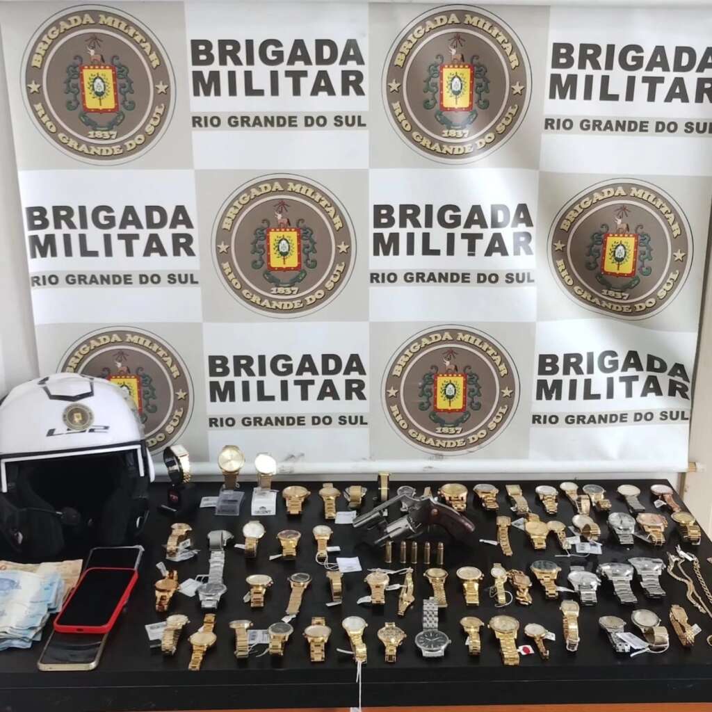 Na revista pessoal, os policiais encontraram um revólver calibre .38, municiado com cinco cartuchos intactos. Também foram recuperados diversos itens roubados da joalheria, incluindo 59 relógios de diferentes marcas, quatro pulseiras de ouro, três celulares e R$ 463 em dinheiro. Uma motocicleta abandonada, com dois capacetes e utilizada na ação, foi apreendida.