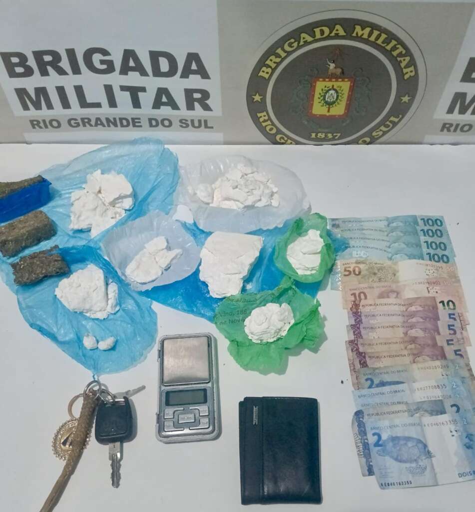 Na busca, foram encontrados aproximadamente meio quilo de substância análoga à cocaína, 140 gramas de maconha, cerca de R$ 500 em dinheiro e uma balança de precisão. Diante da constatação, o homem recebeu voz de prisão e foi conduzido à Delegacia de Polícia de Cruz Alta, onde foi lavrado o flagrante.