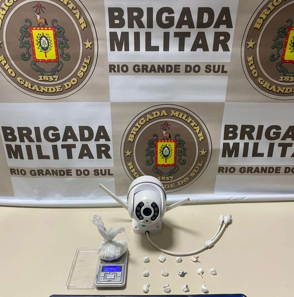Durante as buscas foram localizados um veículo Fiat Uno de cor prata, que estava em situação de furto/roubo, uma porção grande de cocaína com 45 gramas, treze porções de cocaína já fracionadas para comercialização, uma balança de precisão e uma câmera de vigilância.