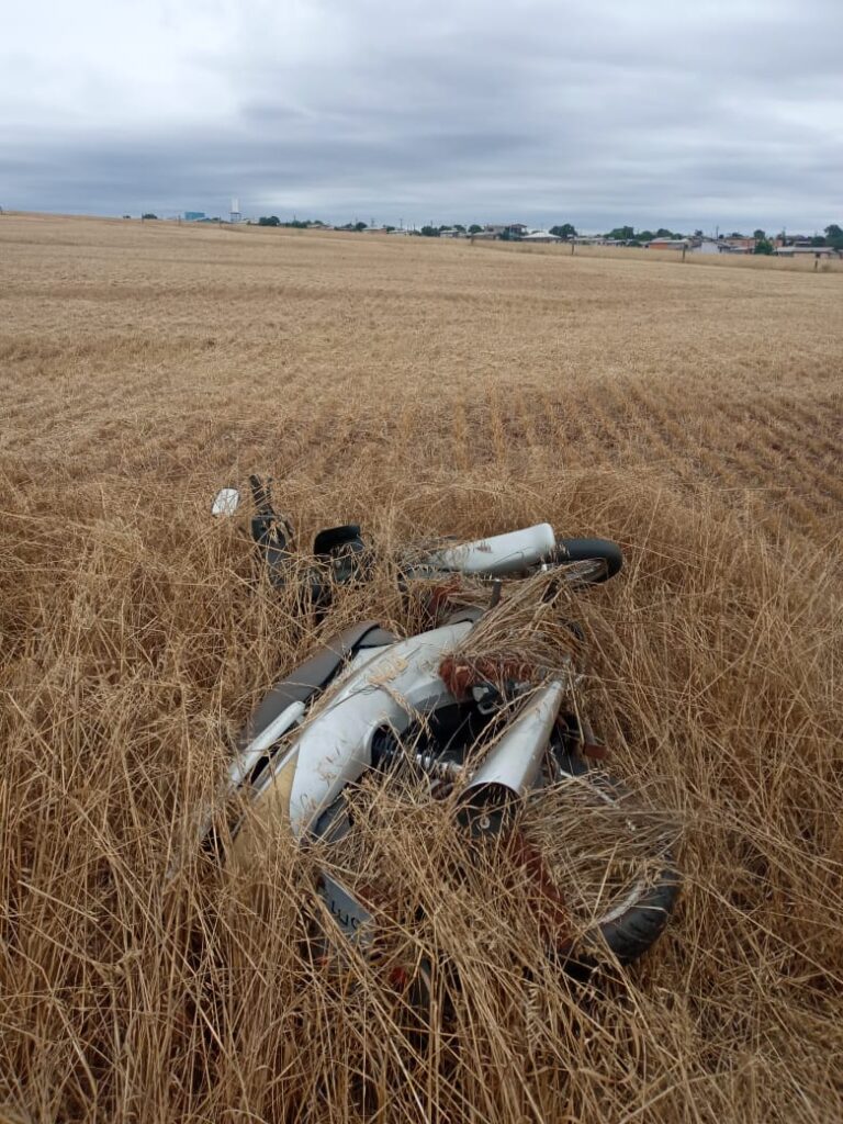 Ao averiguar informações recebidas, os policiais de serviço encontraram a moto SUNDOWN WEB 100, de cor cinza, em situação de abandono, em uma lavoura, no bairro Cooperativa Velha.