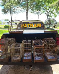 Através de uma denúncia anônima, os policiais militares fiscalizaram uma residência, no bairro Vera Cruz, e flagraram a manutenção ilegal de aves silvestres em cativeiro. As aves estavam presas em gaiolas individuais, sendo identificados pássaros das espécies popularmente conhecidas como, Trinca-ferro, Azulão, Coleirinha, Pintassilgo, Canário-da-terra e Tico-tico-rei, totalizando sete aves silvestres.