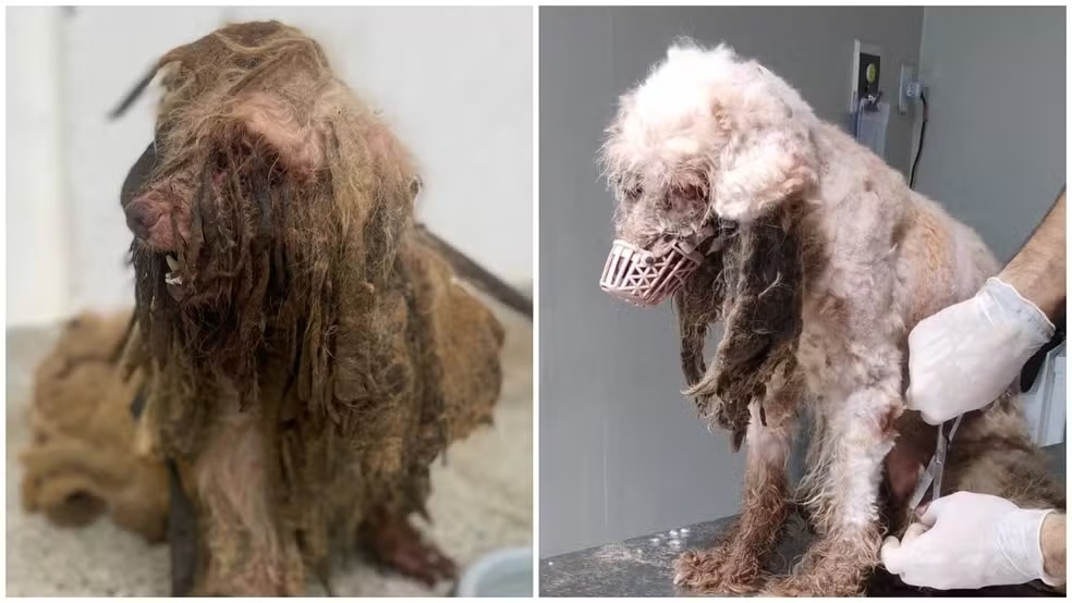 O cachorro Scooby, resgatado pela Polícia na última quinta-feira (27) em Fortaleza, teve 2 quilos e 900 gramas de pelos sujos e endurecidos tosados do corpo. A pelagem excessiva estava ferindo a pele do animal. Ele foi encontrado na casa da tutora com infecção na pele, anemia, magreza e dificuldades de locomoção. A mulher foi presa.