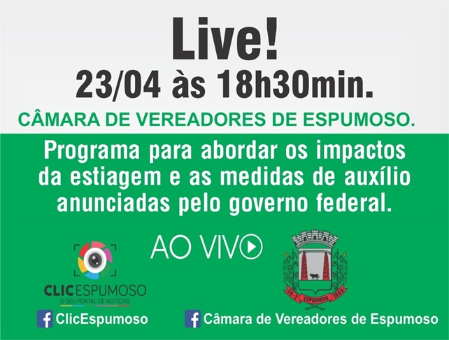 A Live será transmitida ao vivo a partir das 18 horas e 30 minutos, pelas páginas do Facebook da Câmara de Vereadores de Espumoso e pelo ClicEspumoso.