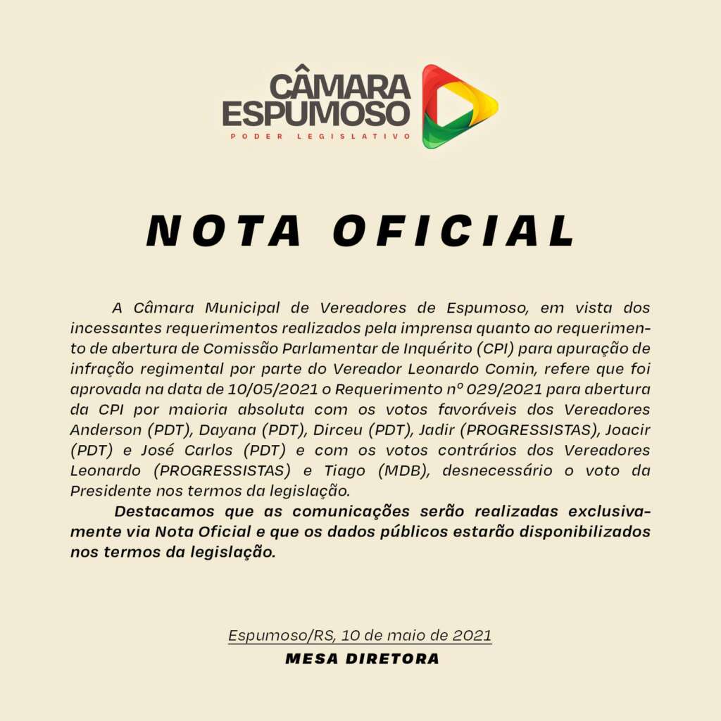 O Requerimento nº 029/2021 para abertura da CPI foi aprovado por maioria absoluta com os votos favoráveis dos Vereadores Anderson (PDT), Dayana (PDT), Dirceu (PDT), Jadir (PROGRESSISTAS), Joacir (PDT) e José Carlos (PDT) e com os votos contrários dos Vereadores Leonardo (PROGRESSISTAS) e Tiago (MDB), desnecessário o voto da Presidente nos termos da legislação.