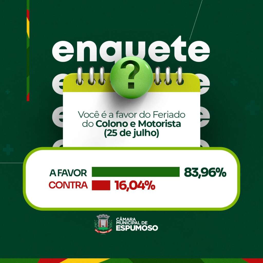 A Câmara de Vereadores de Espumoso encerrou no último dia 12 de julho a enquete que buscava ouvir a opinião da população sobre a manutenção ou retirada do feriado em homenagem ao Colono e Motorista, celebrado em 25 de julho. A enquete, disponibilizada por um período de 30 dias no site oficial da câmara, recebeu um total de 318 votos, revelando a vontade dos munícipes em relação à data comemorativa.