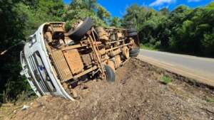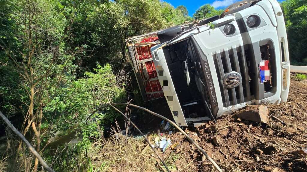 Na manhã desta sexta-feira (26), um acidente de trânsito foi registrado na ERS-324, no km 198, entre Passo Fundo e Marau, nas proximidades do local conhecido como Passo do Chinelo. Um caminhão Volkswagen Constellation 26.260, emplacado em Joaçaba, que vinha de Chapecó com destino a Marau, transportando frangos, tombou após o motorista perder o controle da direção.