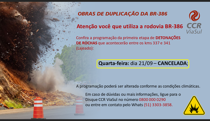 A CCR ViaSul informa que, por conta das condições climáticas desfavoráveis, a detonação prevista para esta quarta (21) na BR-386, entre os kms 337 e 341, em Lajeado, foi cancelada.