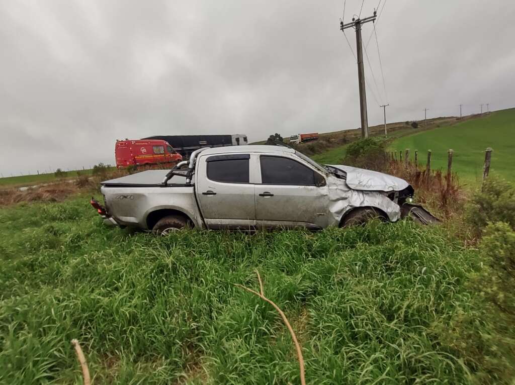 Conforme o Sargento Berton, o veículo é uma S10 com placas de Cruz Alta. A saída de pista resultou em danos materiais.