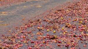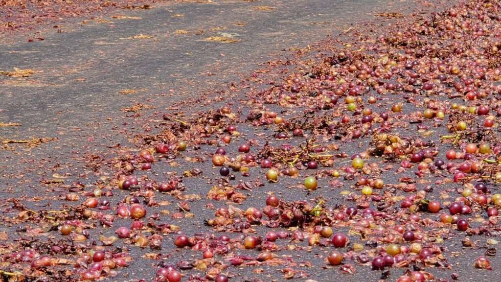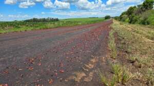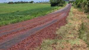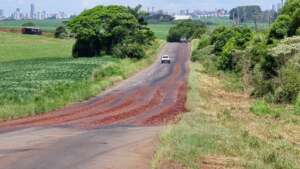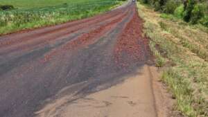 De acordo com as informações, o material se espalhou por uma grande extensão da rodovia, com maior concentração nas proximidades do acesso ao distrito. A presença das uvas deixou a pista bastante escorregadia, aumentando o risco de acidentes.