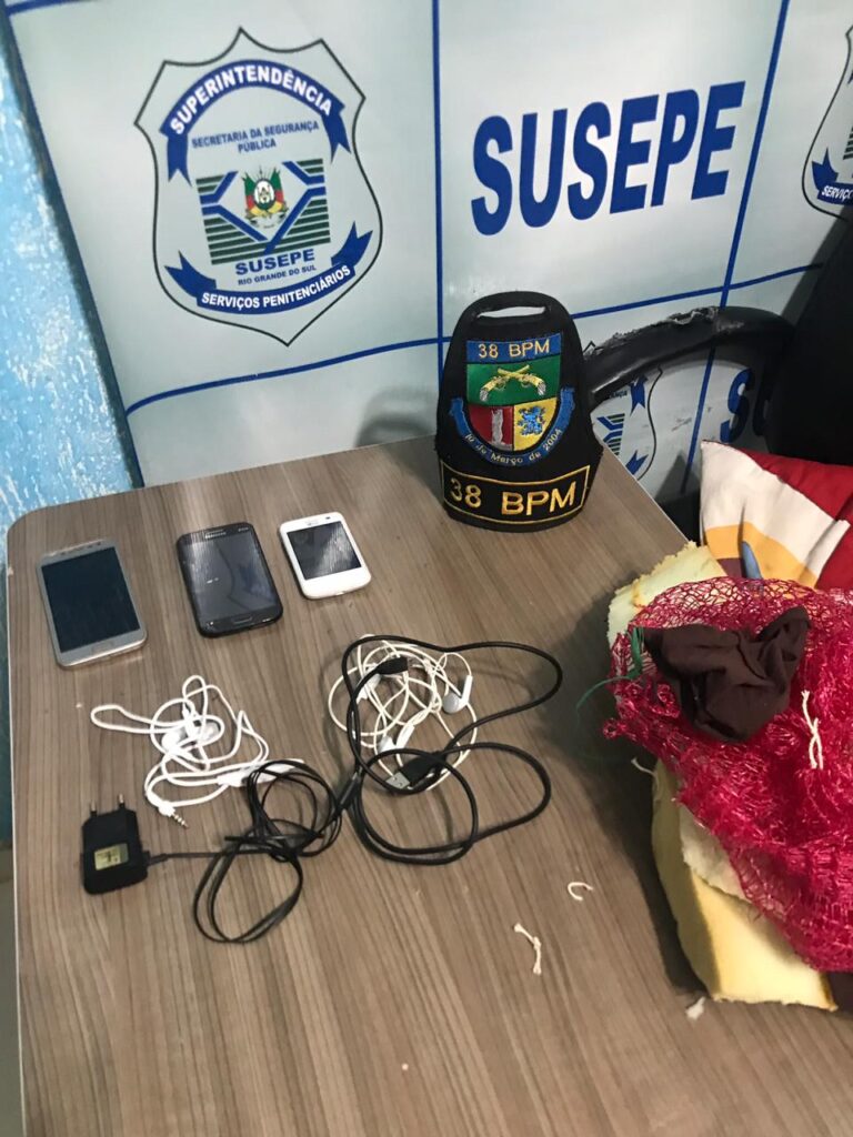 Pela terceira vez somente esta semana, Brigadianos e Agentes da SUSEPE apreenderam celulares que foram jogados para dentro do presídio de de Espumoso. A mais recente apreensão foi durante a madrugada do dia de hoje, no momento da ronda rotineira foi flagrado um arremesso. O mesmo ficou preso na concertina que faz segurança ao pátio do Presídio Estadual de Espumoso, ao verificar o invólucro foram localizados 3 Telefones Celulares, 2 Fones de Ouvidos e 2 Carregadores.