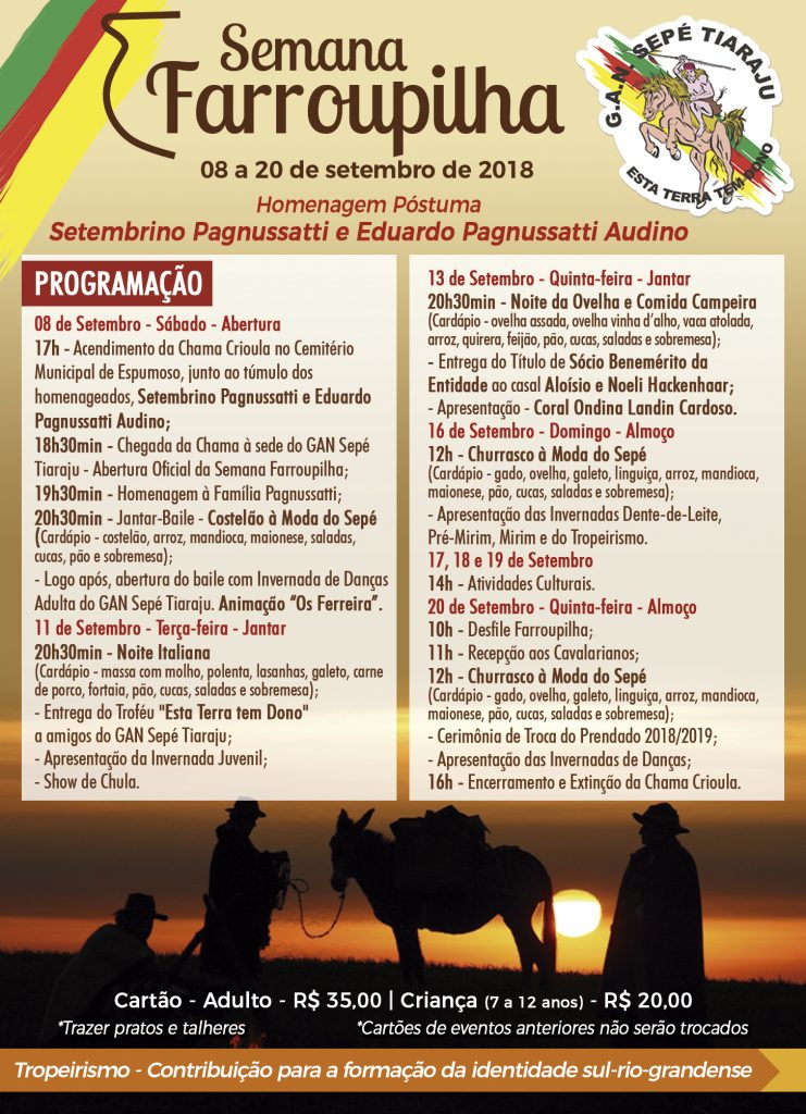 A Semana Farroupilha da família Sepé acompanha o tema “Tropeirismo- Contribuição para a formação da entidade sul-rio-grandense” e segue até o dia 20 de setembro, com inúmeras atrações culturais, artísticas e um cardápio de dar inveja nas jantas e almoços. Os cartões podem ser adquiridos com os integrantes do Grupo ou na sede da entidade.