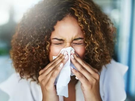 Já a rinite apresenta-se na forma de coriza, irritação dos olhos, espirros, obstrução nasal e dificuldade para respirar, que pode levar à dor de garganta em razão da respiração pela boca.