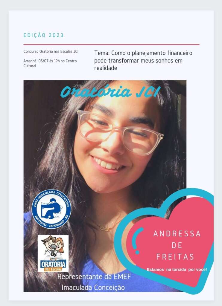 Uma das participantes que representará a EMEF Imaculada Conceição é a estudante Andressa De Freitas, do 8° ano, sob a orientação da professora Suzana Cabral. Esses jovens talentosos demonstrarão suas habilidades de comunicação e persuasão, apresentando argumentos sólidos e convincentes sobre como o planejamento financeiro pode ser um aliado poderoso na concretização dos sonhos.