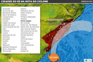 Segundo projeções divulgadas pela MetSul, o ciclone deve ingressar pelo Sul gaúcho, o que fará com que a velocidade do vento se intensifique muito ao longo da tarde e noite de terça-feira, primeiramente pela região extremo Sul e depois para áreas mais ao Sul da Lagoa dos Patos. Na sequência, na noite desta terça, o campo de vento extremamente forte vai se mover pela Lagoa dos Patos e pelo litoral até áreas mais ao Sul do Litoral Norte.