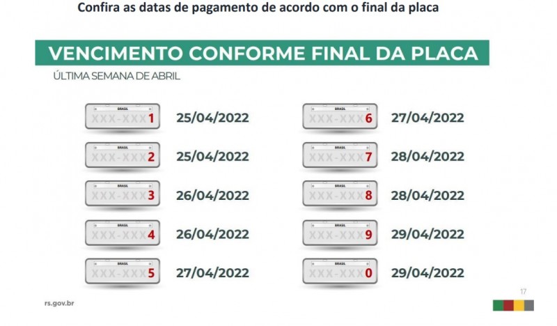 Este ano o calendário foi alterado e os proprietários de veículos terão um prazo maior para realizar o pagamento. Em vez de iniciar o vencimento na primeira semana de abril, o pagamento em parcela única ocorre na última semana do mês. A data limite para placas com final 1 e 2 será 25 de abril. O vencimento dos números seguintes ocorre ao longo da última semana, encerrando-se no dia 29 de abril.