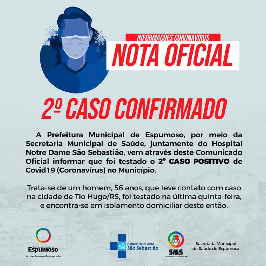 A prefeitura Municipal de Espumoso confirmou nesta terça-feira, 21 de Abril o segundo caso de Covid-19 na cidade.