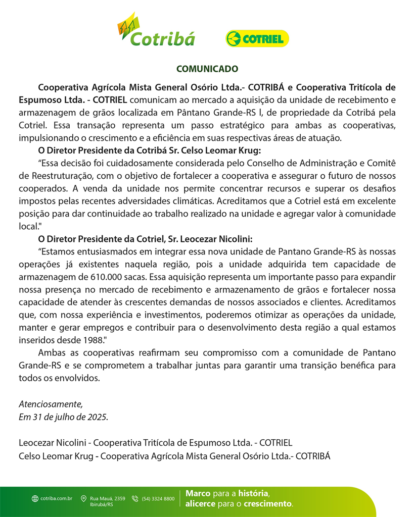 A Cotriel – Cooperativa Tritícola de Espumoso Ltda. – oficializou, nesta quinta-feira, 31 de julho de 2025, a aquisição da unidade de recebimento e armazenagem de grãos da Cotribá, localizada às margens da BR-290, na cidade de Pantano Grande, no Rio Grande do Sul.