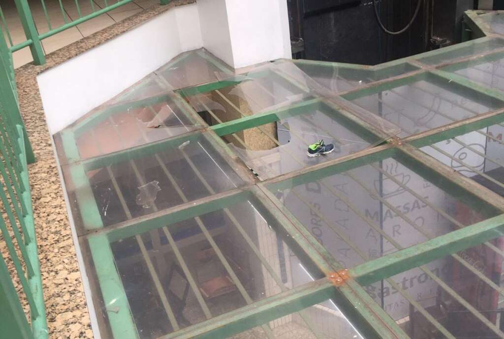 Com o impacto da queda, a estrutura quebrou e ela caiu no piso do mercado.