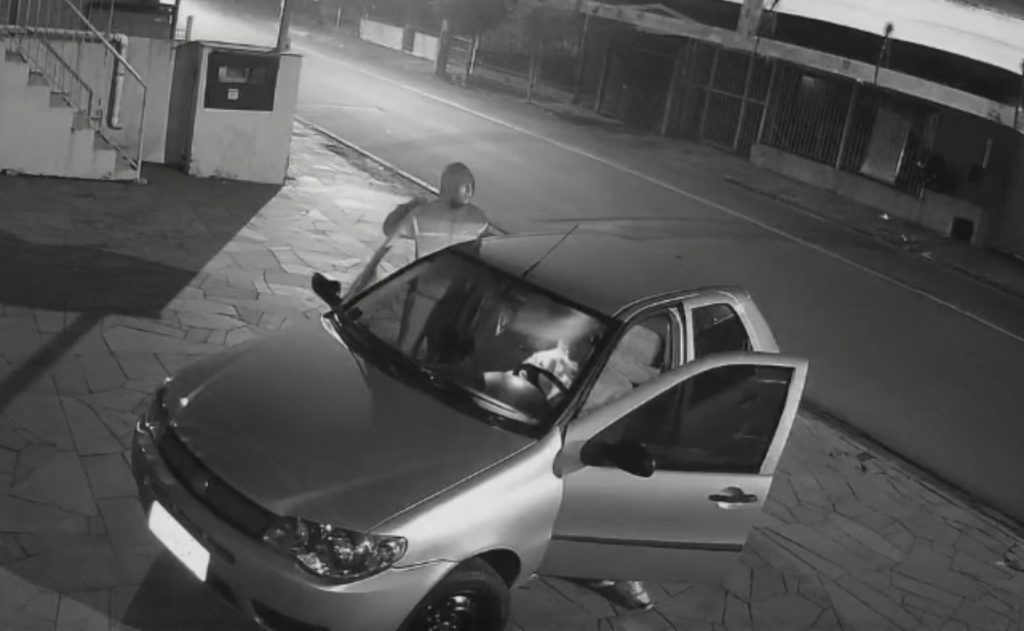 Imagens de câmeras de segurança obtidas pela reportagem da Rádio Uirapuru mostraram o momento em que dois homens abandonam o veículo da vítima na Rua Parobé, bairro Cruzeiro, e deixam o local a pé.